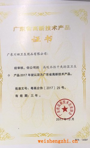 榮譽資質(zhì) 廣東省高新技術(shù)產(chǎn)品證書(輕呼吸棉柔衛(wèi)生巾產(chǎn)品)