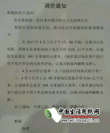 3月的后一天,來自造紙廠的漲價函再次飛起。浙江、安徽、福建等地二十多家造紙廠發(fā)出漲價函,多數(shù)造紙廠都選擇在4月5日那一天進行提價,多數(shù)每噸提價達300元,而其中富陽十一家造紙廠集體漲價的通知函尤其奪目。