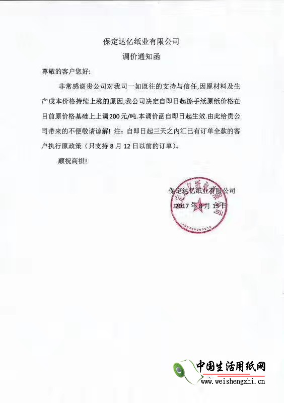 保定市億達(dá)紙業(yè)有限公司漲價(jià)函: