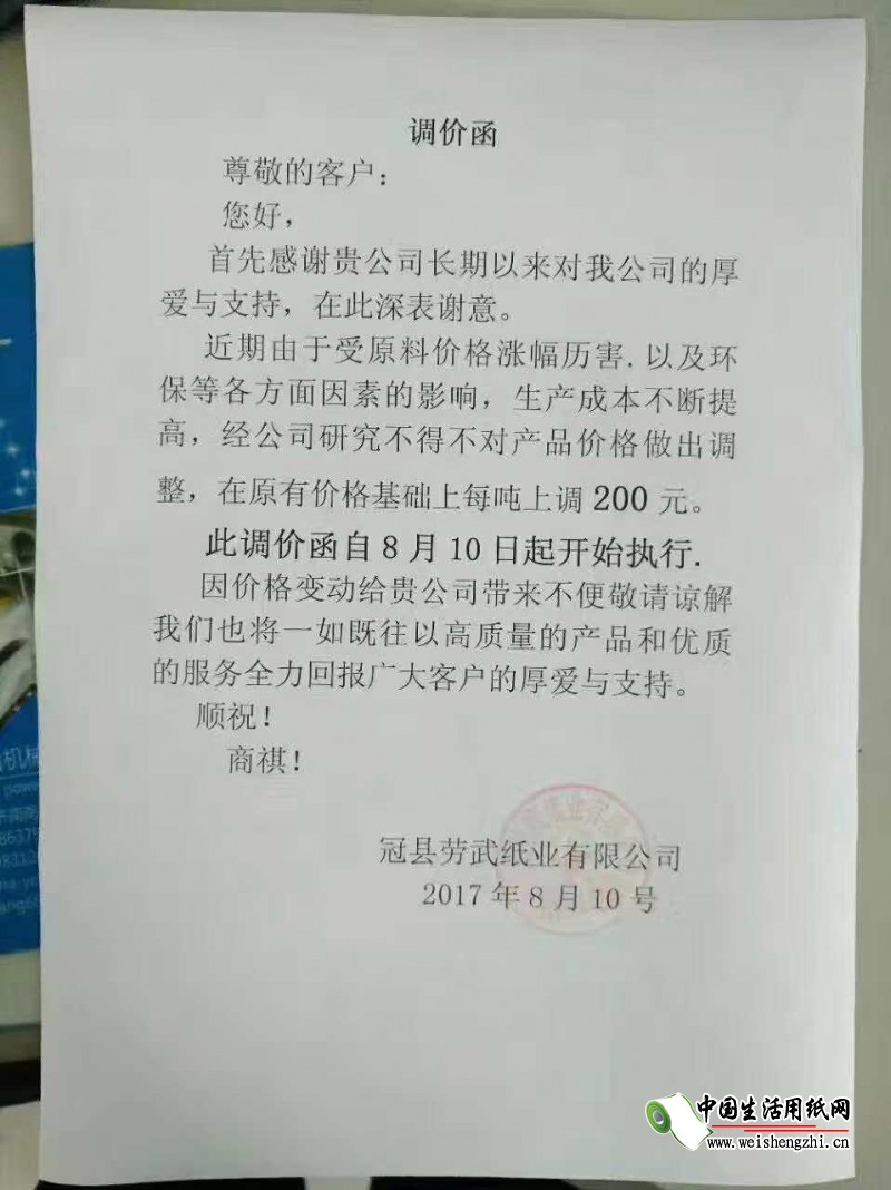 冠縣勞武紙業(yè)有限公司漲價(jià)函:
