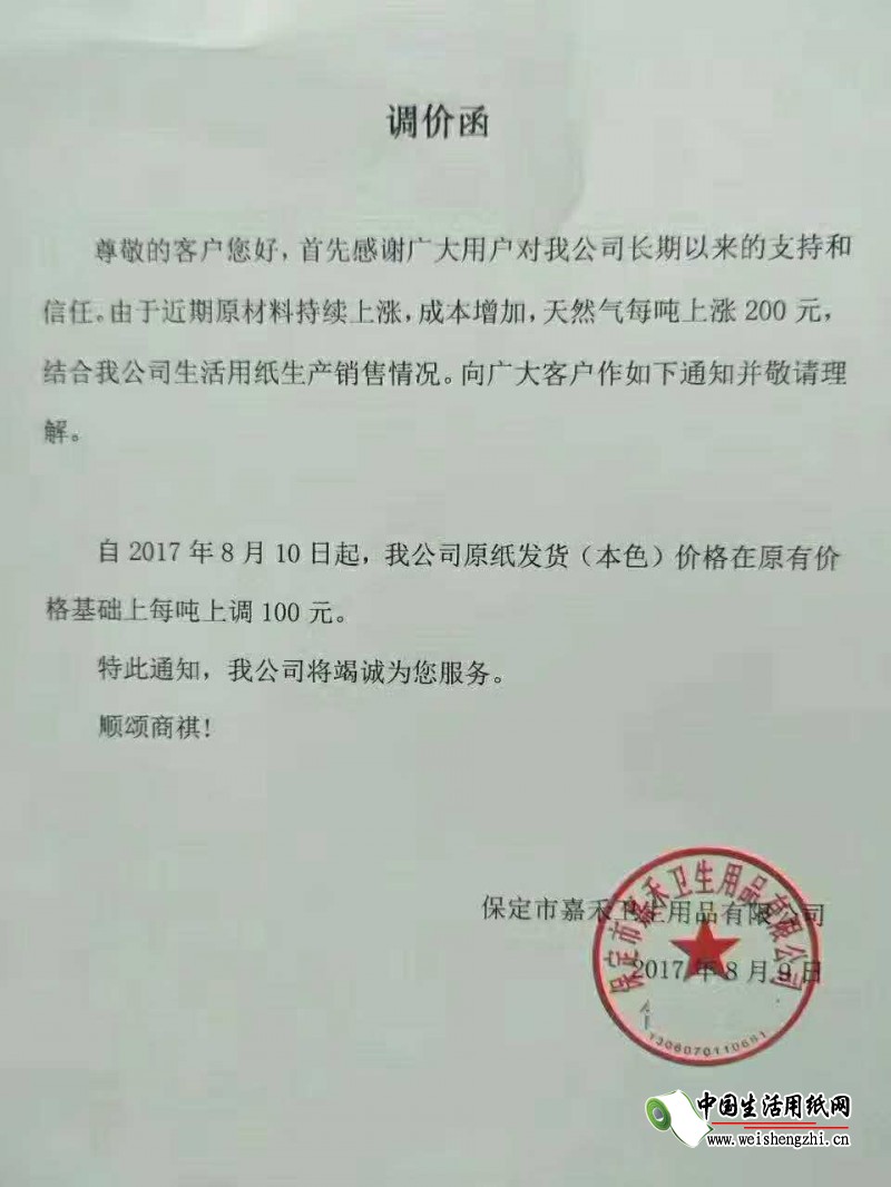 保定市嘉禾衛(wèi)生用品有限公司漲價(jià)函: